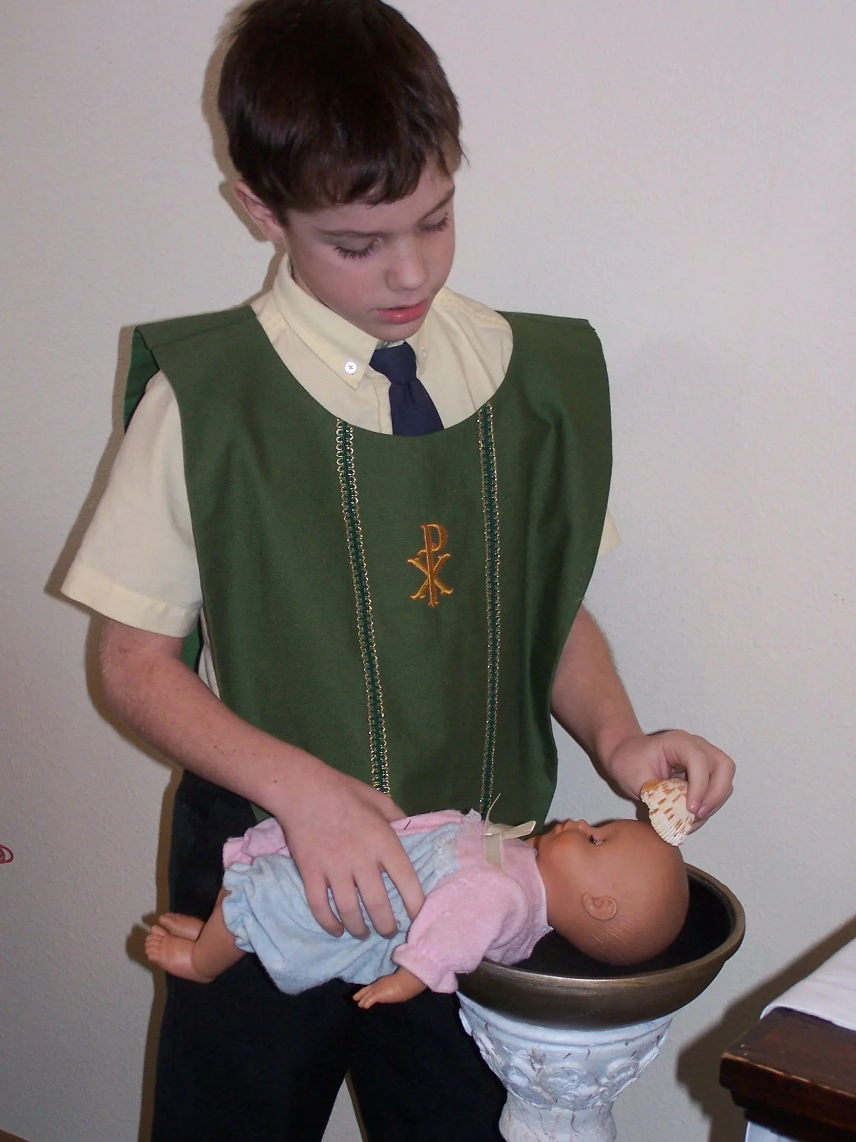 We encourage children to wear the array of colorful chasubles that were made to fit them and imitate what they see during the service at their own child-sized altar.